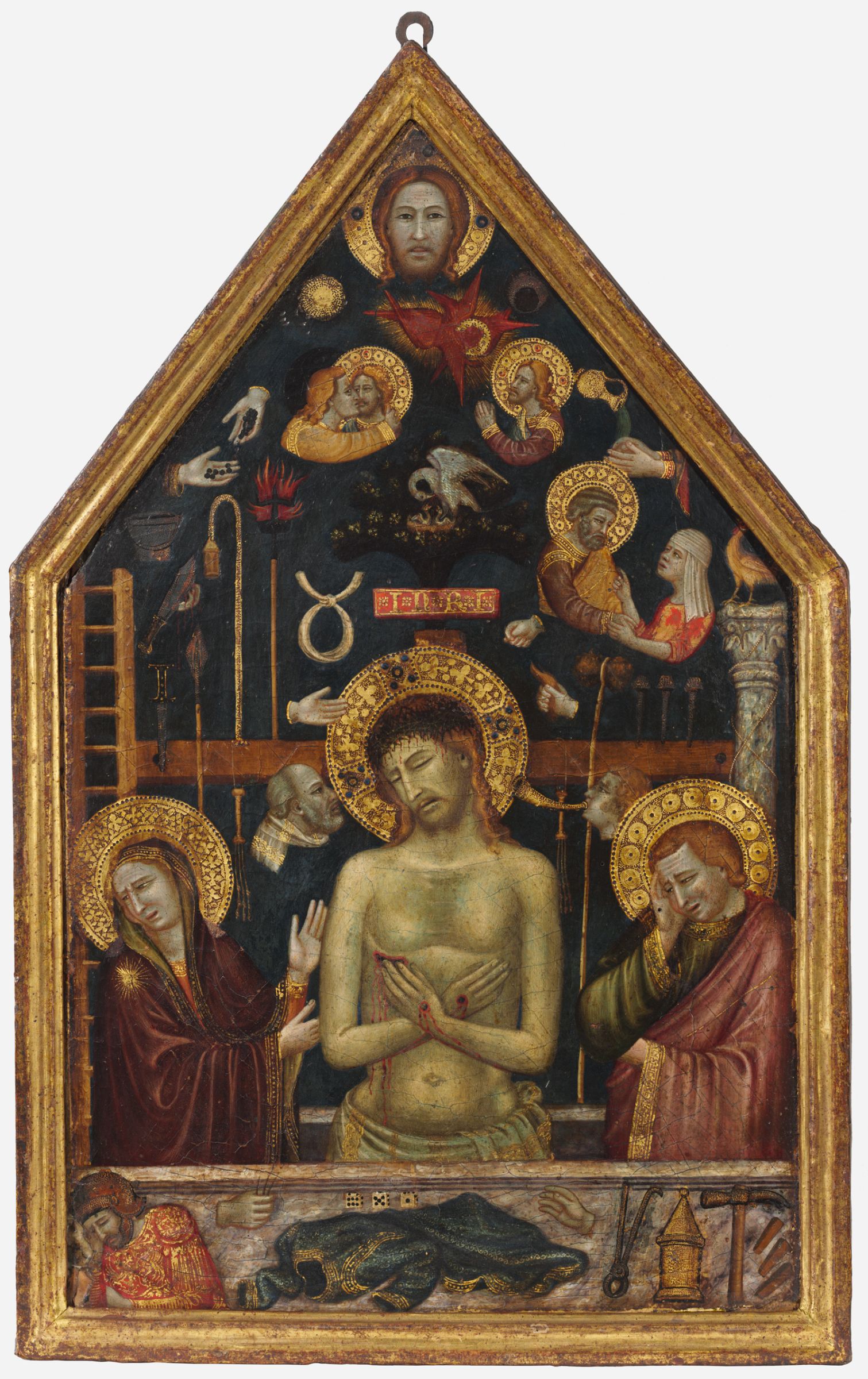 This is a fourteenth-century panel painting by Roberto Oderisi of Naples depicting the Man of Sorrows and the Arma Christi.