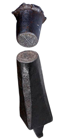 Dies like this one were used to make the designs seen on Medieval coins. A metal blank would be placed between the upper and lower dies, then the upper one would be struck with a hammer. This would leave a design imprinted in the metal disc, creating a coin.