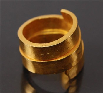 An ingot is a general term for metal mass that has yet to be made into a finished product. These bits of metal would be melted down in order to be formed into jewelry, coins, or other objects. This particular ingot is rolled into a spiral shape, indicating that it may have been strung and carried.