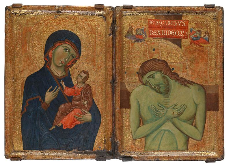 This is an Italian diptych dating from 1255-1260. One side depicts the Virgin and Child and the other side portrays Christ as the Man of Sorrows.
